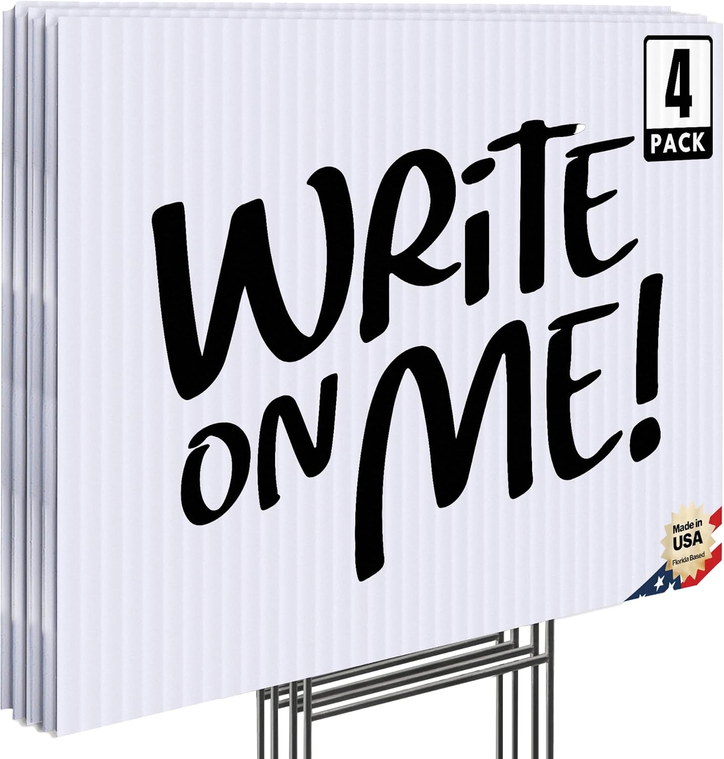 Elevate your advertising and event promotions with our 24""x18"" double-sided blank yard signs. Designed to provide a versatile blank canvas on both sides, these yard signs allow you to express personal messages, promote events, advertise businesses, or support campaigns with maximum visibility. Whether it’s for open houses, fairs, gardens, parks, warnings, or commercial events, these signs are your go-to solution for any occasion.Crafted from premium corrugated board, these signs are built to endure the outdoor elements, ensuring your message stays vibrant and clear over time. The durable material guarantees long-lasting visibility, making them perfect for both short-term and long-term use.Installation is a breeze with the included sturdy metal H-stake, measuring 24"" wide and 10"" tall, with an 8"" support bar for added stability. Simply insert the stake into the ground, and your sign will stand firm, securely displaying your message without hassle.The versatility of these blank yard signs offers endless possibilities for customization upon receipt. Whether you’re hosting a yard sale, promoting an event, or raising awareness for a cause, these signs are ready to meet your needs.Proudly made and assembled in the USA, our yard signs not only support local businesses but also ensure high-quality standards. Trust in American craftsmanship and enjoy the reliability and excellence these signs bring to any event or campaign.Order your 24""x18"" double-sided blank yard signs today and make sure your message is seen loud and clear!