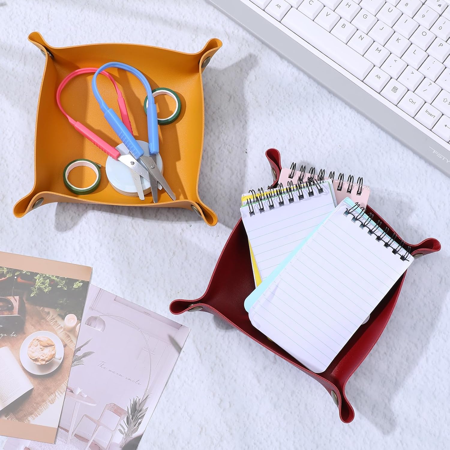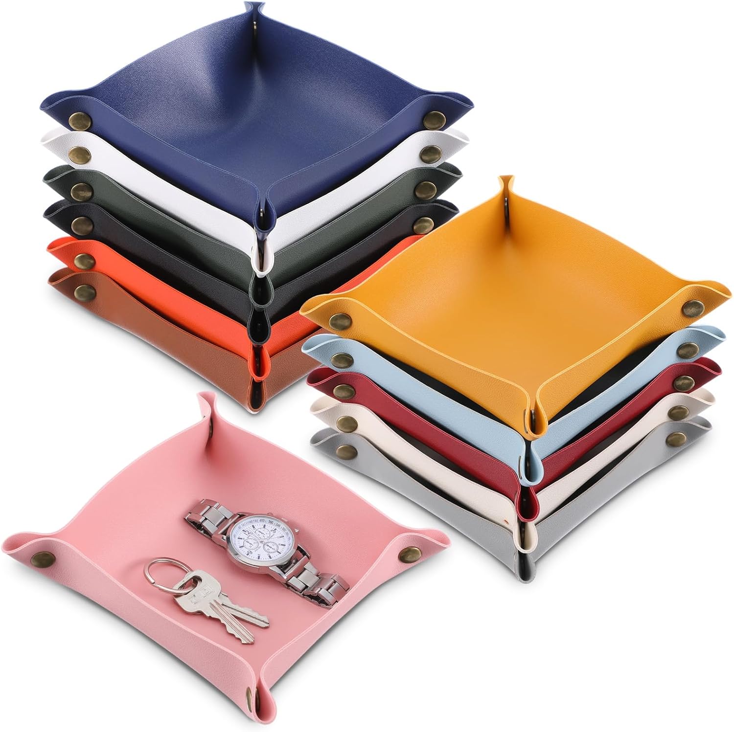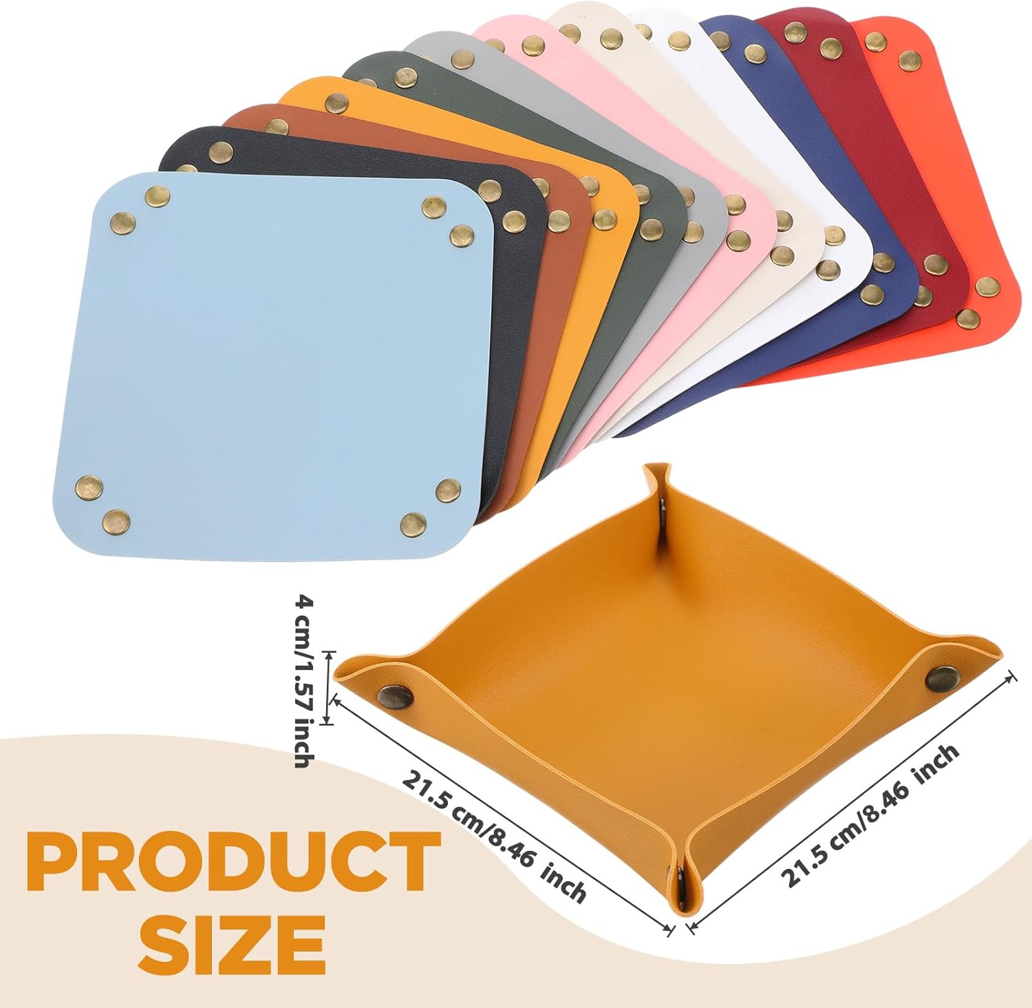 Features:Multi-Item Organization:6.5x6.5" compartments hold phones, wallets, and watches simultaneously. Raised 1.4" edges prevent items from sliding, functioning as reliable entryway trays for daily essentialsInstant Setup:Assemble in 10 seconds by snapping corner buttons. No tools required – the rigid base supports 3lbs immediately after assembly, ready for use as a desk organizerSpecifications:Material: PUColor: 12 ColorsSize: aboutProduct dimensions: 7.87*7.87*0.08 inchesInstallation dimensions: 6.57*6.57*1.38 inchesPackage includes:12 x Leather Valet TrayNotes:Manual measurement, please allow slight errors on size.The color may exist a slight difference due to different screen displays.