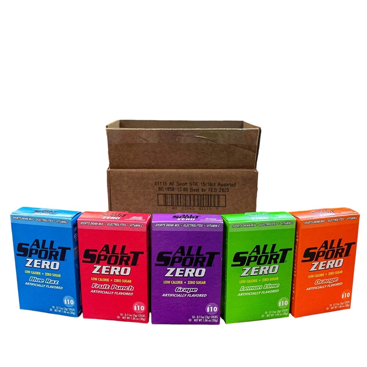 All Sport Zero is scientifically formulated to suit the needs of today's athletes, workforce, gym goers, or anyone looking for a great-tasting sports drink with zero calories! All Sport Zero gives you the electrolytes and vitamins you need without all the calories and sugar. All Sport is Hydration for Everybody. All Sport Zero has five great-tasting flavors. These flavors are sweet and not too salty (1/2 the Sodium of Leading Sports Drink), so they are enjoyable through all new Vending Pack of 10 Stick in the Box. (Also available in vending variety case of 150 count (15 vending 10 packs [3 of each flavor]). Take All Sport with you wherever you go! Add contents to a 16.9 oz bottle of water. Add to 20 oz of water for a lighter taste. 24 month best-by date. Perfect for Vending Machines!