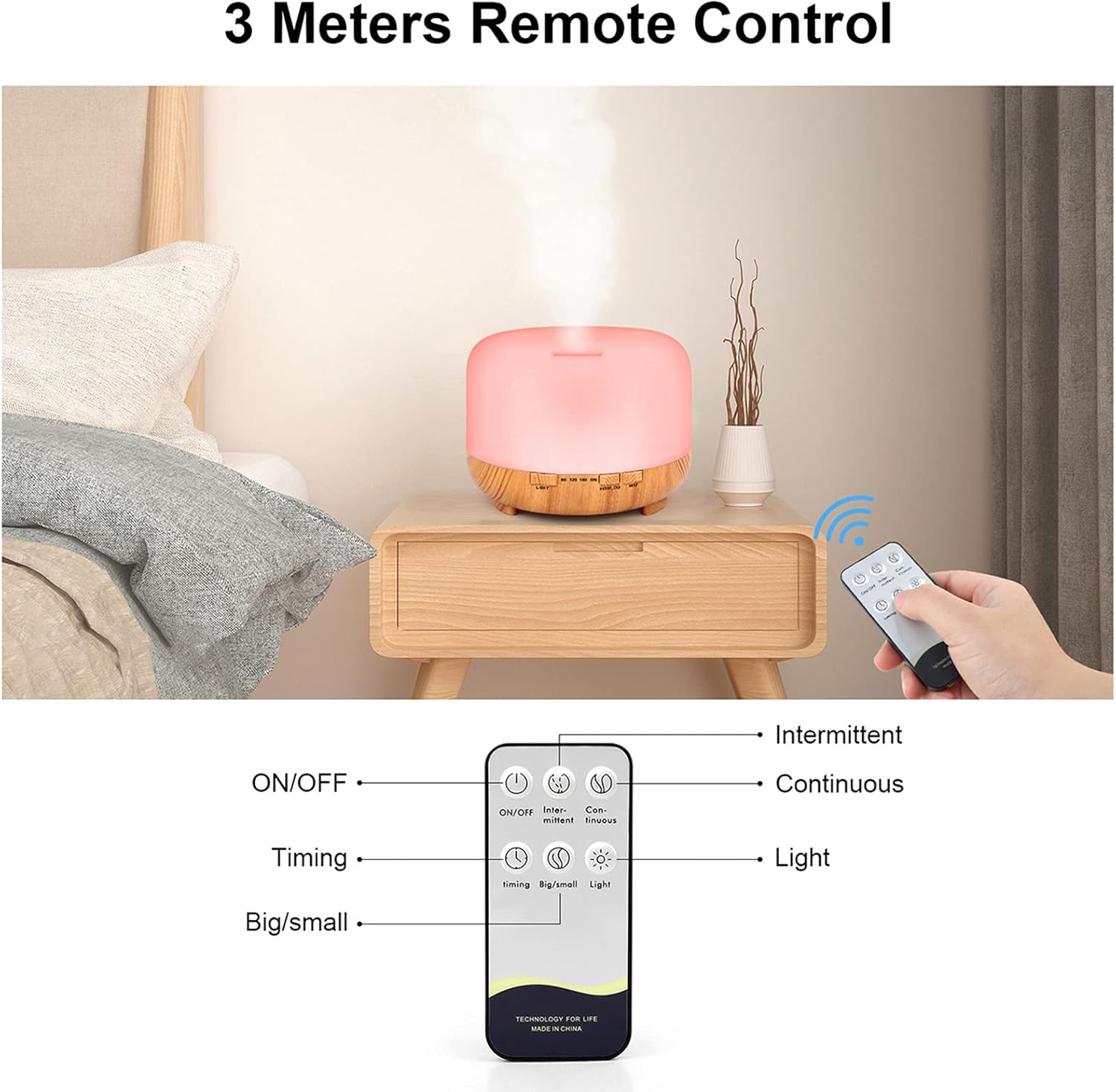 This is a Humidifier with diffuser with a 500ML water tank, also an aroma diffuser for essential oils, or simply use as a humidifier. It's an 8 - 12 hrs diffuser with 7 soothing colors led light. Humidifier and diffuser combo with timer (60Min/120Min/ 180Min/steady on),will auto shut off when time is up or water runs out. Ultra-quiet make sure you sleep comfortably. Mist Control: Press the "MIST" button for one second, you will hear the sound "DI" then choose the timer from 60Min/120Min/180Min/steady on/turn off. Press the "HIGH/LOW" button, you will hear the sound "Di Di", then you could choose the strong and weak mist mode. Light Control: Press the "LIGHT" button to turn on the LED light, the color will change automatically. Press the "LIGHT" button again to fix the color. Press the "LIGHT" button again to change color. If you need to turn it off, please long press the "LIGHT" button. What's in the box: 1 x 500ml Essential Oil Diffuser, 1 x Adapter; 1 x Measuring cup; 1 x remote control; 1 x User Manual(all in the water tank).