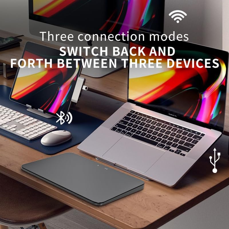 Welcome to Function Trackpad – a smart trackpad designed for multi-device users. Whether it's office, creation, or daily use, it can bring you an efficient and smooth operating experience. 🔹 Three-mode connection for wide compatibility It supports three connection modes: Bluetooth, 2.4GHz wireless, and USB-C wired, allowing you to pair three devices at the same time and switch quickly. It is perfectly compatible with Windows 8 and above, Mac OS 10.11, iOS 13.4 and other systems to meet the needs of different scenarios. 🔹 Wide touch for smooth operation It adopts a 160x115mm large-size glass touch panel, which supports Precision Touch (PTP), which has a fast response speed and a smooth feel. Built-in a variety of system preset gestures, such as two-finger zoom, three-finger switching application, four-finger display desktop, etc., can be used directly without complex settings. 🔹 Freely switch between multiple devices Easily connect to computers, tablets, mobile phones and other devices, and seamlessly switch between different devices with a short press of the mode button, especially suitable for multi-screen office and cross-platform operators. 🔹 User-friendly design Equipped with physical left and right buttons, it supports vibration feedback function (can double-click the switch), and the Type-C interface is convenient and fast to charge. The ultra-thin body is only 5mm and weighs as little as 147g, making it easy to carry. 🔹 Long-lasting, efficient and energy-saving Built-in 500mAh lithium battery, the sleep current is only 0.3~0.8mA in energy-saving mode, and the touch wake-up time is only 200ms, which can last for several days on a single charge.