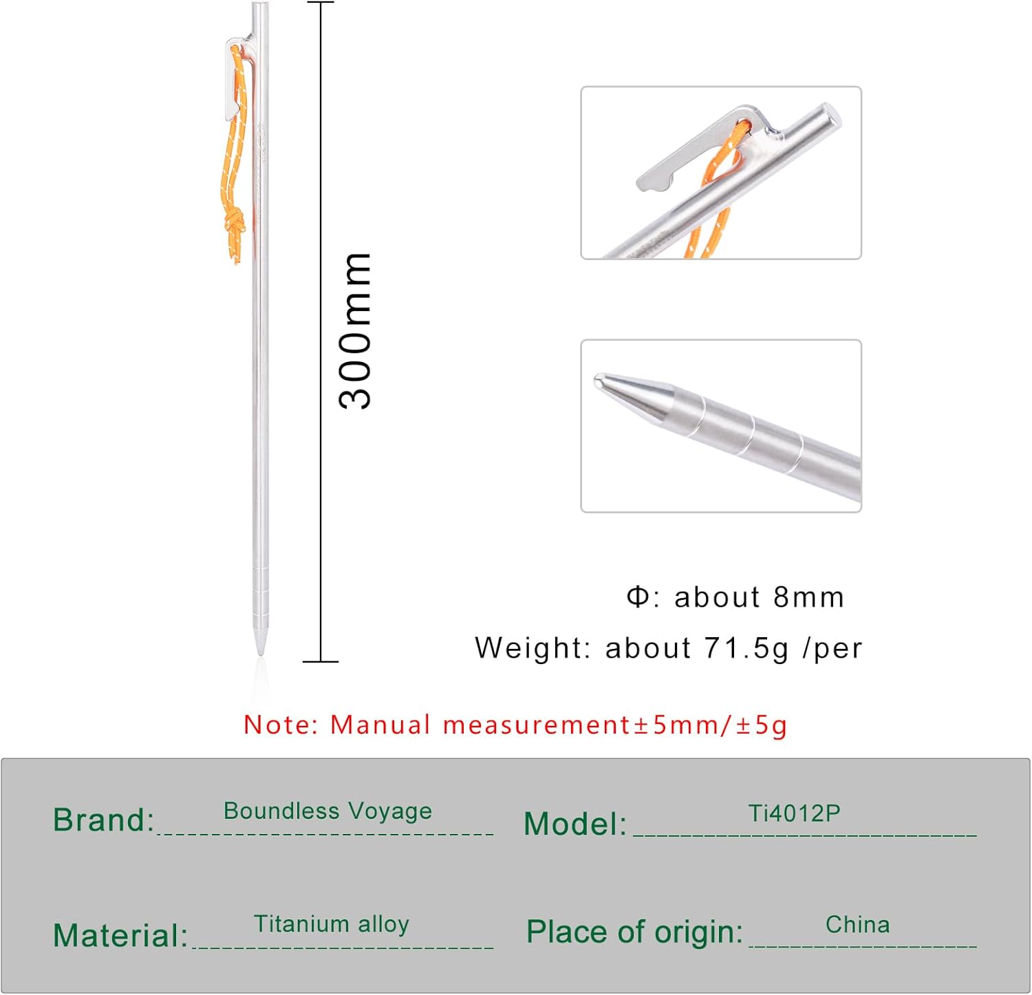 Struggle with Stakes That Bend or Won't Hold?Upgrade your camp setup with iBasingo Titanium Stakes. Designed for campers who value reliability and weight savings, these stakes provide the ultimate hold without weighing down your pack.Why TC4 Titanium?TC4 (Grade 5 Titanium Alloy) is the top choice for demanding applications. Compared to aluminum or steel, it offers unmatched durability. These stakes resist bending in hard ground and won't corrode, season after season. It's a smart investment in durable camping equipment.Choose Your Perfect LengthMatch the stake to your environment for optimal security:20cm & 24cm: Great for ultralight tents and firm ground.30cm & 35cm: The versatile choice for most family camping tents.40cm: Essential for soft ground, sand, or high-wind conditions.Safety Meets ConvenienceThe included reflective ropes add a layer of safety by marking your guylines at night. No more stumbling! They also help you locate stakes quickly when packing up.Built for the Long TrailiBasingo gear is crafted for real adventures. We focus on smart design and robust materials, so you can focus on the experience.Specifications:Material: TC4 Titanium AlloySizes: 20cm x 7mm, 24cm x 8mm, 30cm x 8mm, 35cm x 8mm, 40cm x 8mmWeight per Stake: 36g, 57.8g, 71.5g, 81g, 93gPack: 6 stakes of one size + reflective ropesIdeal For: Backpacking, hiking, car camping, beach trips, and festivals.Ready for Any Adventure?Equip yourself with stakes you can trust. Order your iBasingo Titanium 6-Pack today.